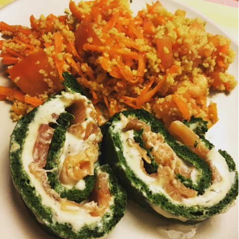 Fiz uma salada de tomate, cenoura ralada e couscous para acompanhar estas belas fatias de torta de espinafres e salmão!